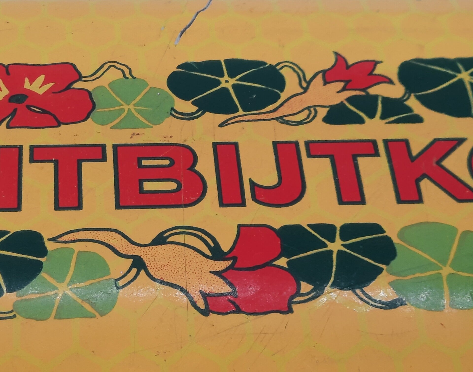 Rechthoek, donkergeel blik met scharnierend deksel met een decor van bloemenslingers (Oost-Indische Kers). Dit blik is gemaakt in de periode 1945 - 1960. Dit blik is in een hele goede vintage staat en sluit nog prima. De binnenzijde is wat donker gekleurd hetgeen logisch is gezien de leeftijd.