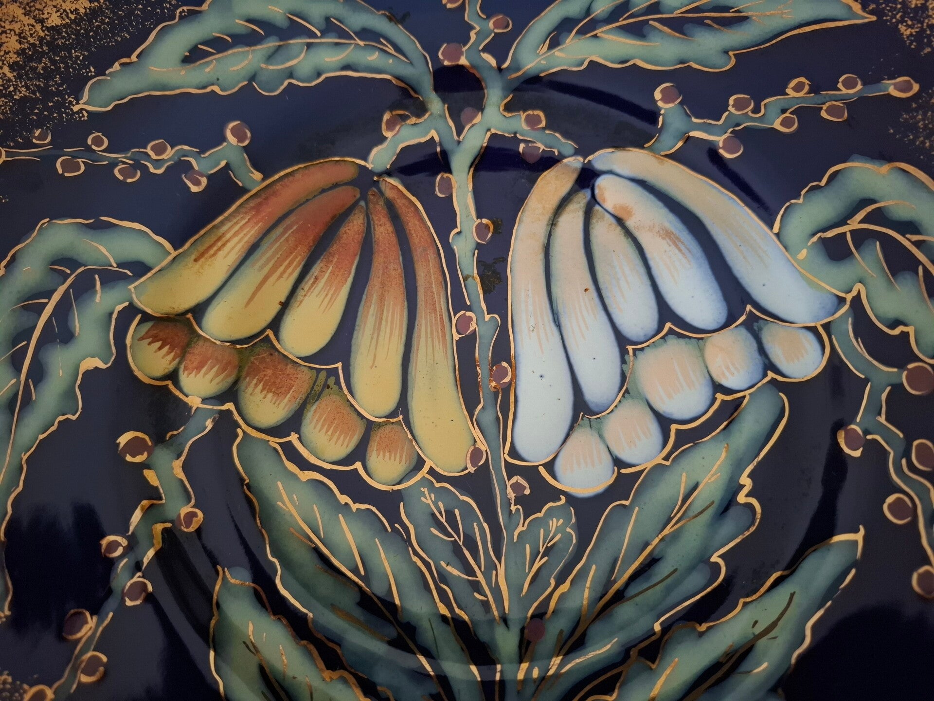 Vintage schaal van Regina Gouda Holland in kobaltblauw, gedecoreerd met een bloemdecor en gouden randen en afgewerkt in glanzend glazuur (decor Eljo). De schaal is volledig gemerkt aan de onderzijde mét het kroontje en genummerd (nummer 824). De letters WB staan voor de oprichters van de fabriek Regina: Gerrit Frederik van der Want en Georges Antoine Alexis Barras. De fabriek werd opgericht in 1898, het kroningsjaar van koningin Wilhelmina, en gesloten in 1979. Daarna werd het Artikhove tot 1993.