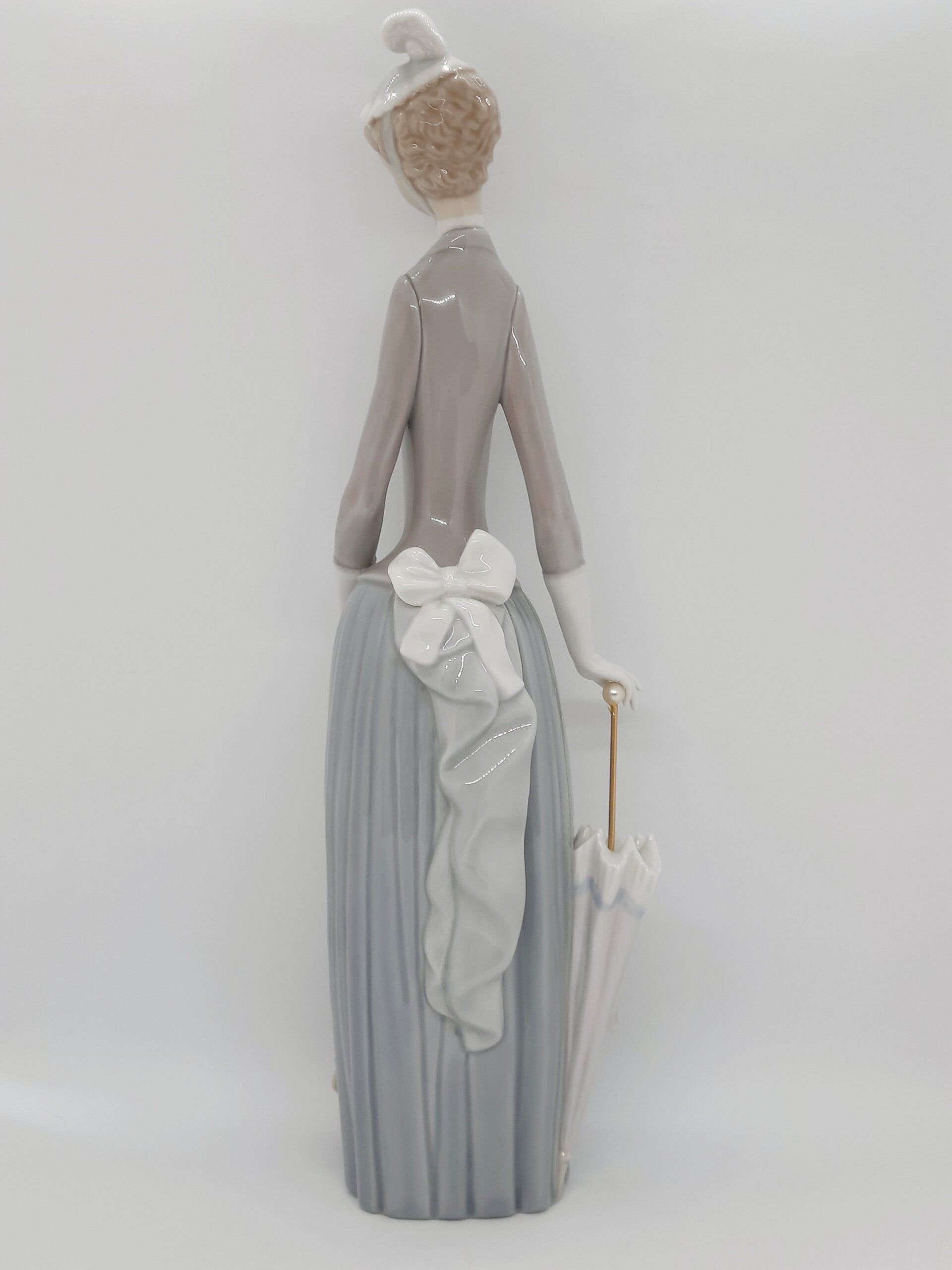 Vintage beeld van Lladro Spanje van een vrouw uit die aan het wandelen is met haar hondje. Dit beeld, dat in productie was van 1971 - 1993 is gemaakt door Vicente Martinez en heeft het nummer #4761. De Spaanse naam is 'Dama de Bulevar'. Het beeld is van glanzend porselein en uitgevoerd in de kenmerkende pasteltinten. Dit beeld van Lladro Spanje is in een uitstekende kwaliteit, geen chips of barsten.