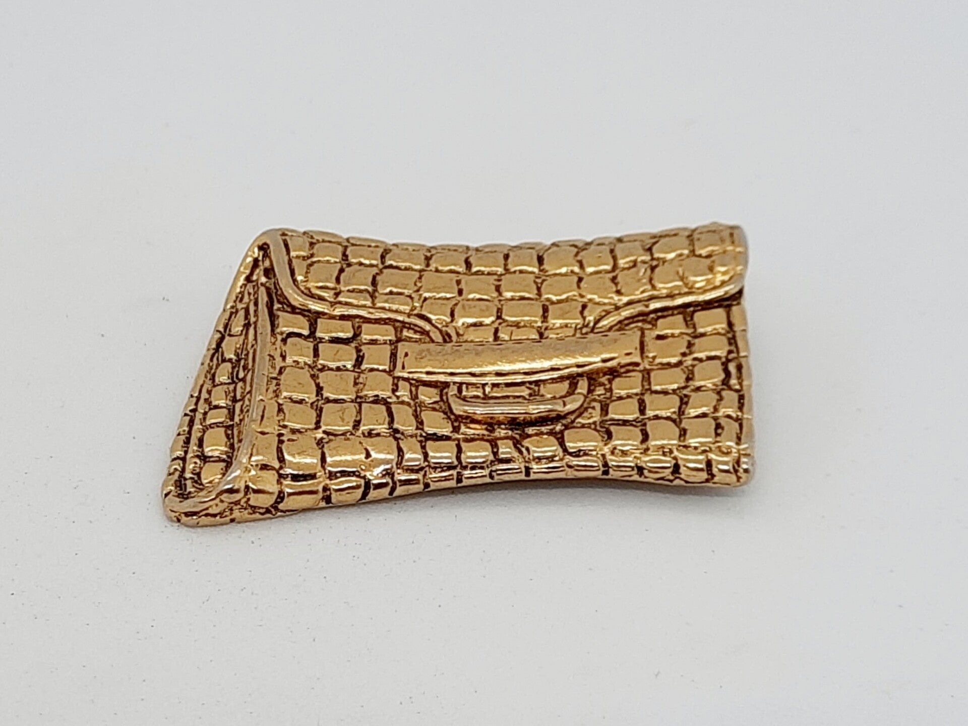 Goudkleurige broche in de vorm van een tasje met het effect van slangenleer.