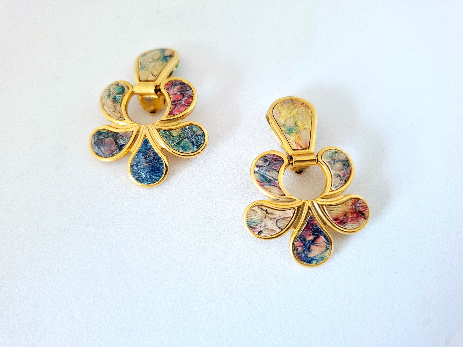 Kleurige, vintage oorbellen met clips. Deze jaren '80 oorbellen hebben verlopende kleuren in een goudkleurige zetting. De 'bloem' zit flexibel aan de clip. De oorbellen zijn in een uitstekende vintage conditie. Ze zijn niet gemerkt.