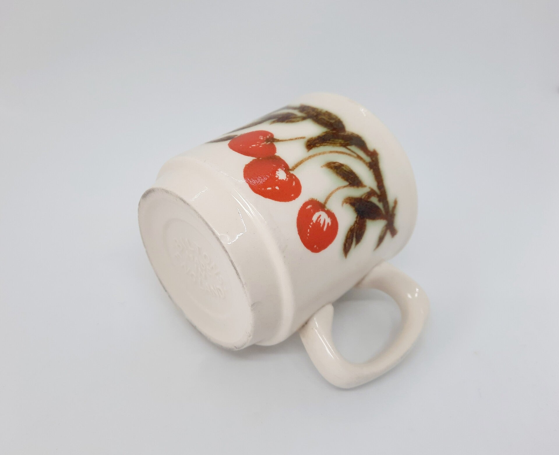 Vier retro mokken van Biltons, Made in England, met gezellige fruitdecoratie. Deze aardewerk mokken, jaren '70, zijn van zijn in een zeer goede staat. Aan de onderzijde wat kleine fleebites.