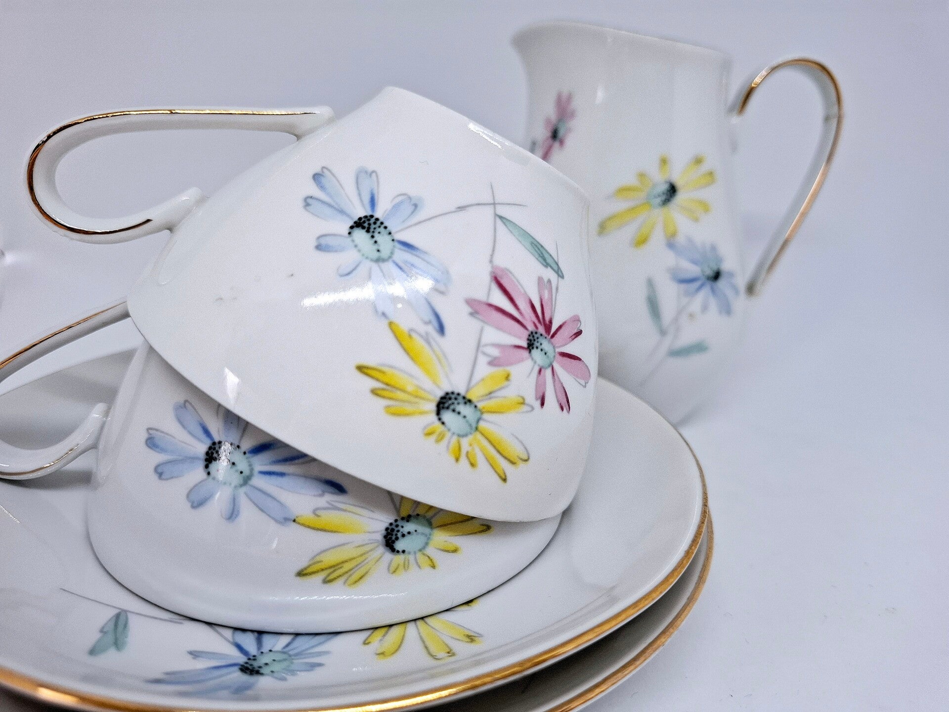 Twee kop-en-schotels van porselein en bijbehorend roomkannetje van Kahla DDR, jaren '60 .Deze kop en schotels en het kannetje, decor 'Daisy's pink, yelow en blue, zijn in een uitstekende staat zonder chips of barsten. Het kannetje is ooit gerepareerd zoals te zien is op de foto's. Dit kannetje is daarom gratis bij aankoop van de vintage kop-en-schotels van Kahla.