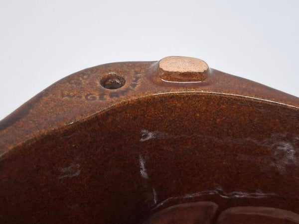 Bruine, vintage bakvorm van keramiek in de vorm van een vis. Deze jaren '70 vorm is voorzien van een ophangoogje en in en uitstekende staat. De vorm is op de achterzijde gemerkt met 'West-Germany' en het nummer 982-19. Een leuke decoratie in de keuken.