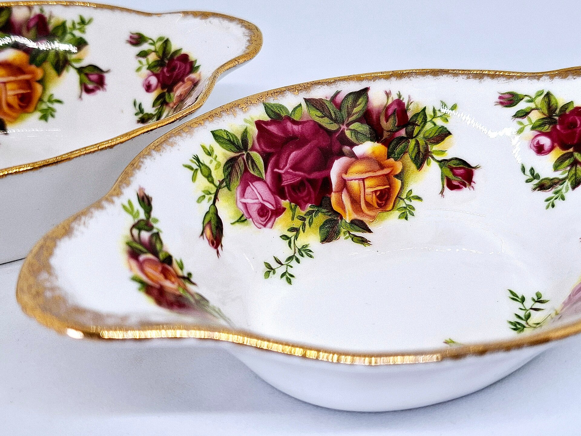 Twee vintage schaaltjes uit de serie Old Country Roses van Royal Albert, Engeland. De decoratie op deze schaaltjes van Bone China is ontworpen door Harold Holdcroft in 1962. Hij werd voor de serie Old Country Roses geïnspireerd door de Engelse landelijke tuinen. Dit ontwerp is uniek in zijn soort. Puur wit porselein voorzien van rode, roze en gele rozen met randjes verguld met 22 karaat goud. Deze twee schaaltjes zijn puntgaaf. Tip: niet in de vaatwasser.