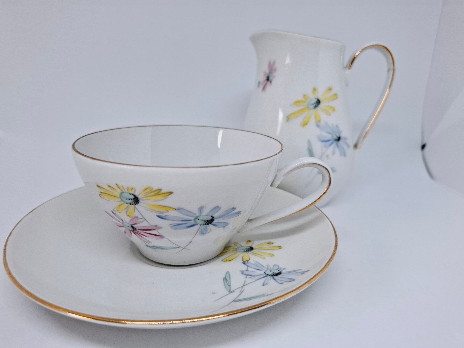 Twee kop-en-schotels van porselein en bijbehorend roomkannetje van Kahla DDR, jaren '60 .Deze kop en schotels en het kannetje, decor 'Daisy's pink, yelow en blue, zijn in een uitstekende staat zonder chips of barsten. Het kannetje is ooit gerepareerd zoals te zien is op de foto's. Dit kannetje is daarom gratis bij aankoop van de vintage kop-en-schotels van Kahla.