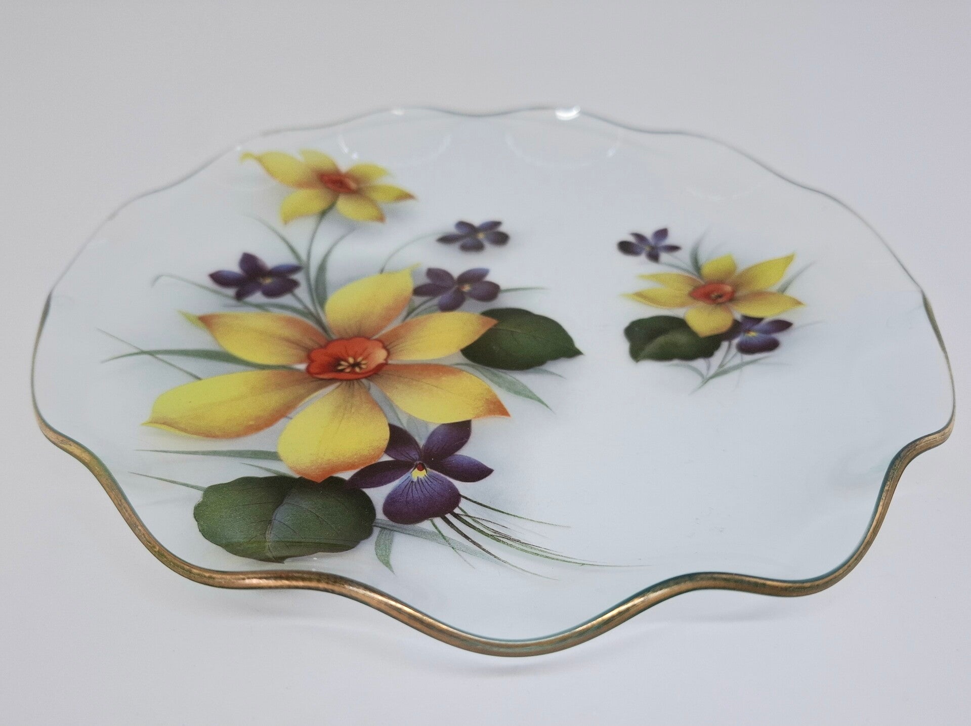 Chance Glass serveerschaaltje of bonbonnière met een floraal decor en een gegolfd gouden randje. Dit Engelse Mid-Century Modern art glass schaaltje is in een uitstekende conditie zonder barsten of chips.