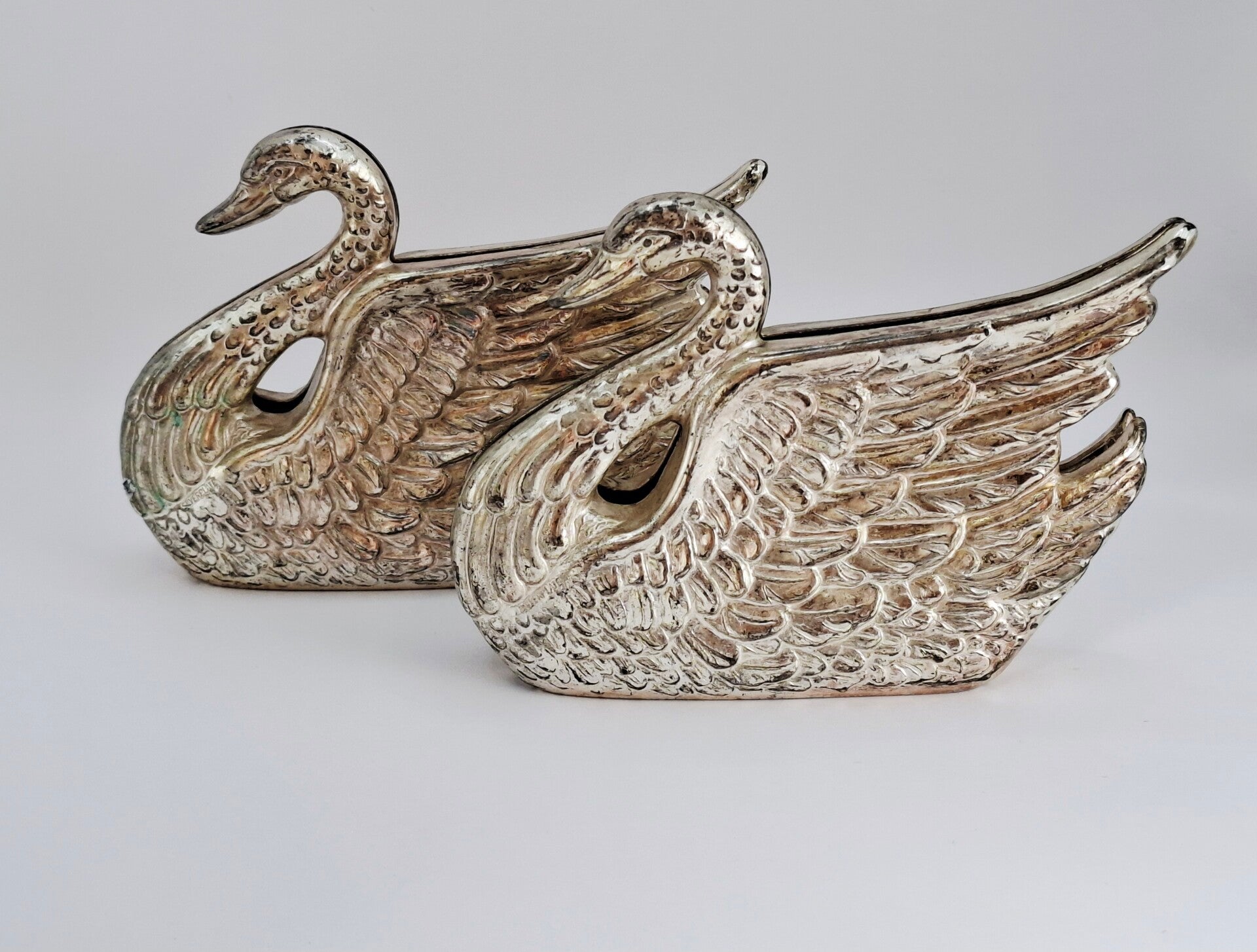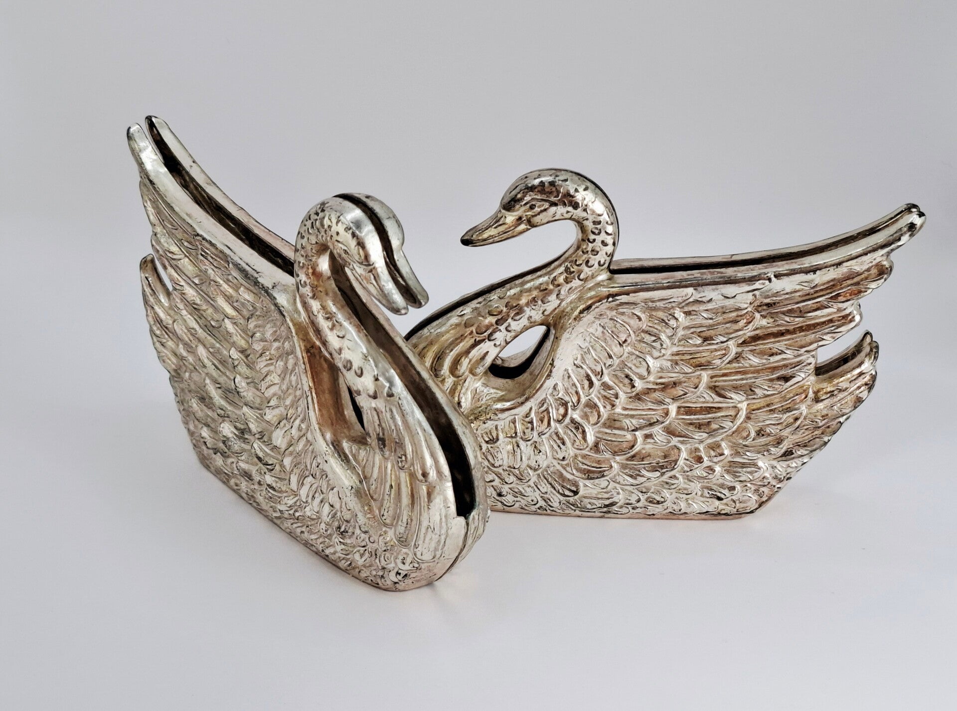Deze Silverplated '70 fotohouder of menukaarthouder staat mooi op tafel als tafelobject maar op een bureau kan deze elegante zwaan ook gebruikt worden als brievenhouder of voor je mooiste foto. De zwaan fotohouder is gedetailleerd uitgevoerd en het huidge patina zorgt voor een mooie, vintage uitstraling die overeenkomst met de leeftijd. Er zijn er twee te koop.
