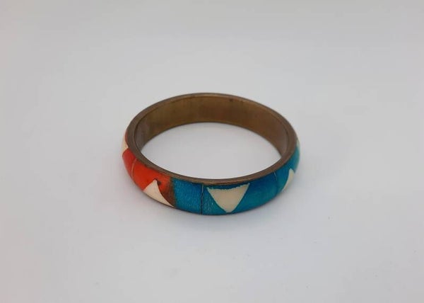 Deze tweedehands Boho set van vrolijk gekleurde armbanden zijn écht iets voor de zomer. De armbanden bestaan uit gekleurde vakjes op een koperkleurige ondergrond. Eén armband is smaller dan de andere. Beide armbanden, zonder sluiting, zijn in een uitstekende staat.