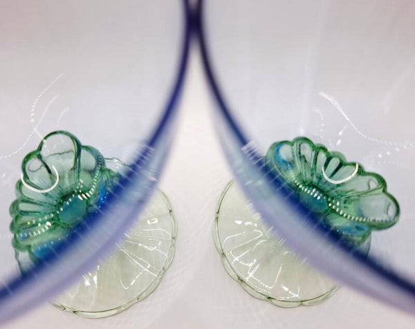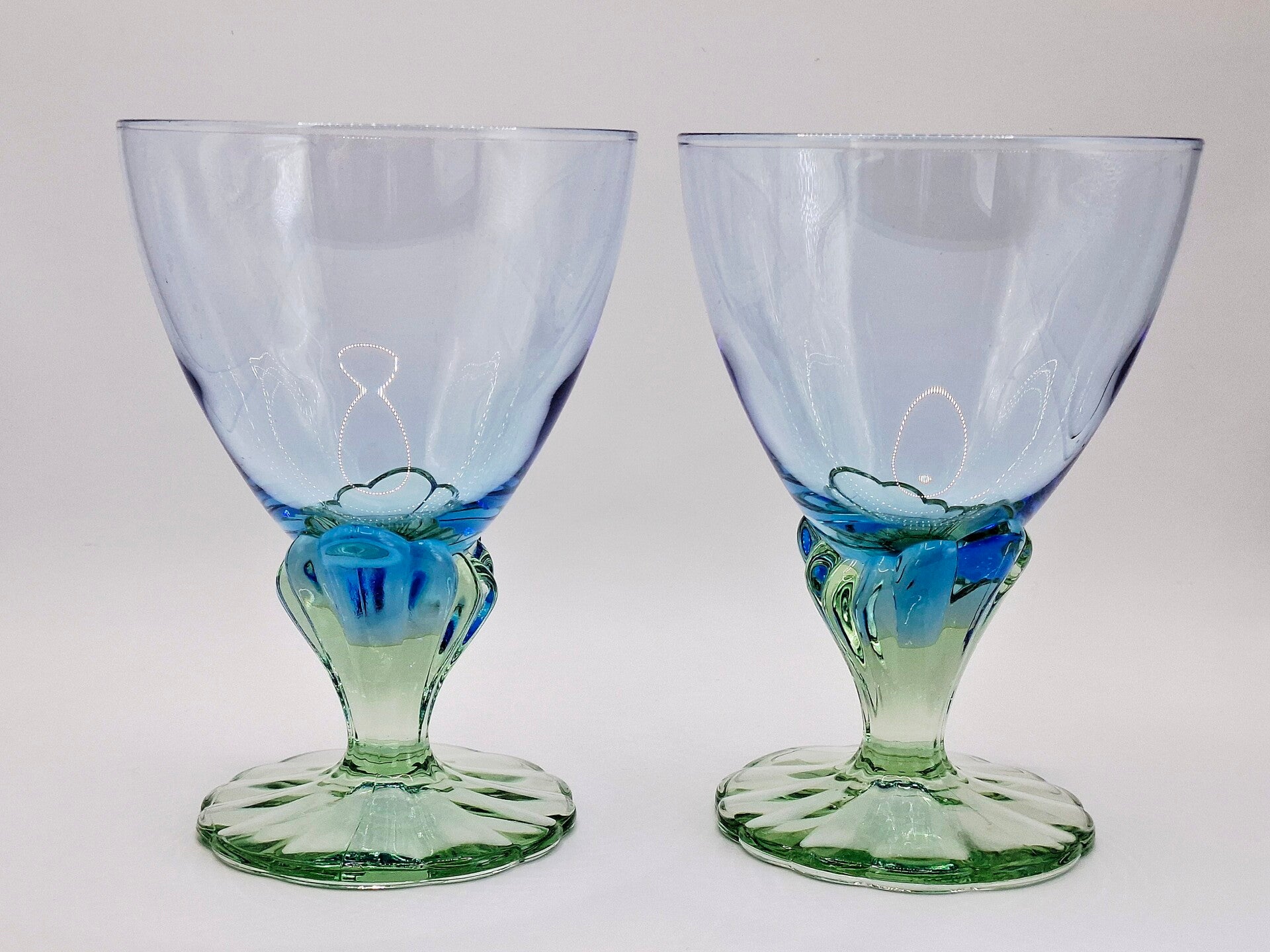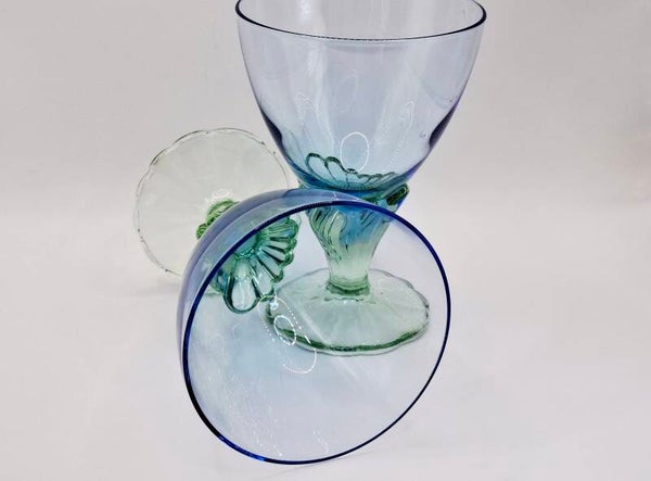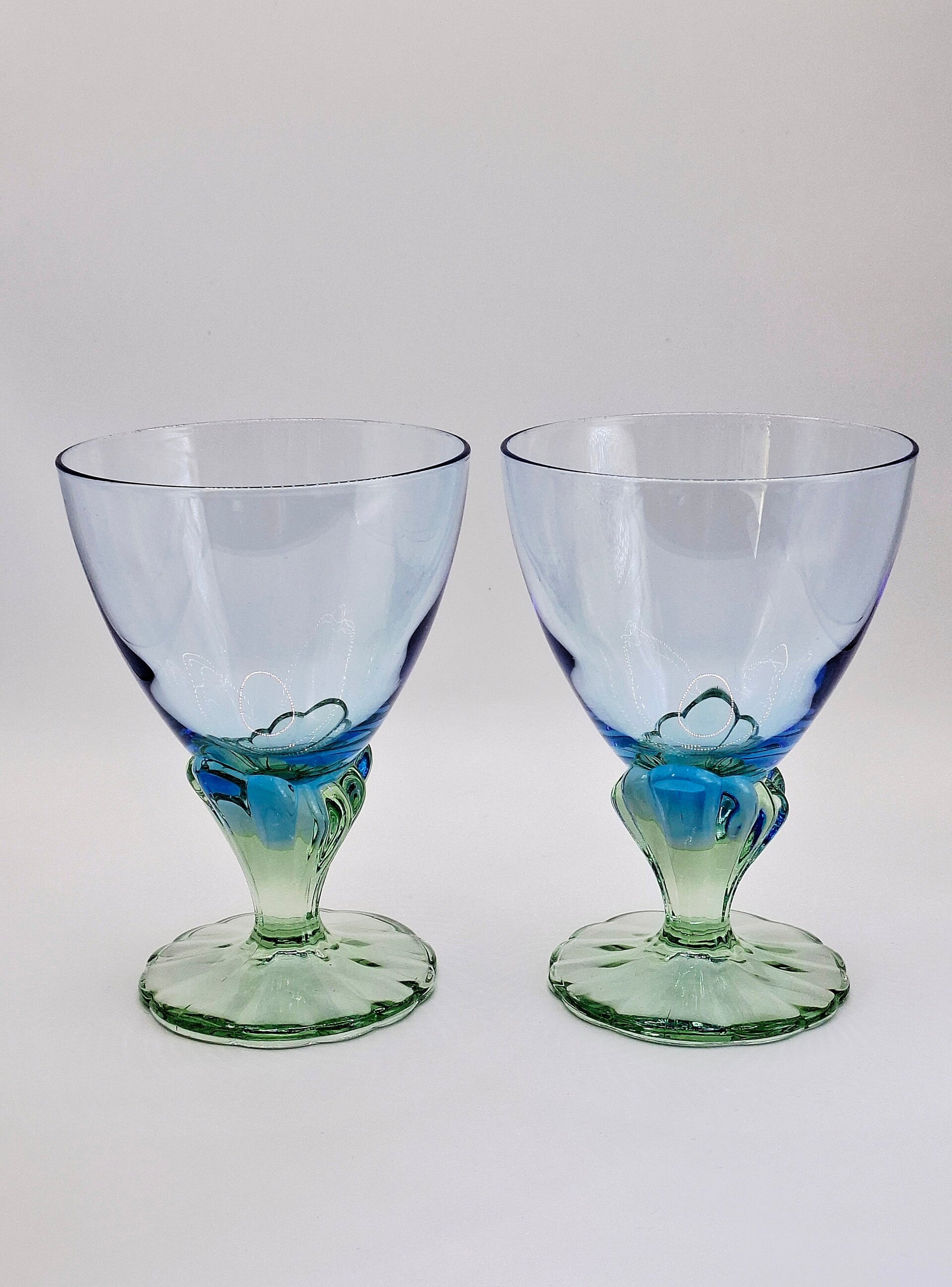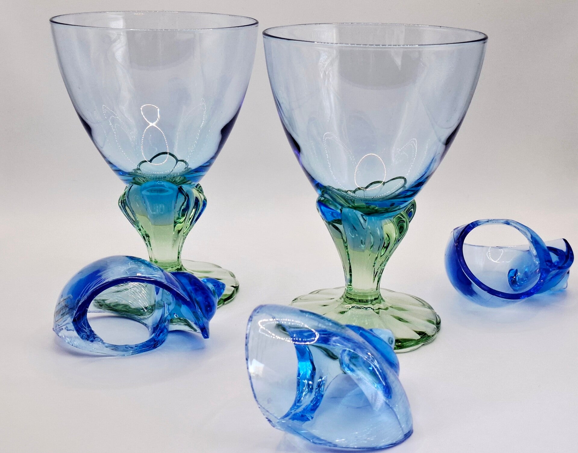 Twee elegante Bahia glazen uit de jaren '80/'90 in betoverende kleuren. Ze zijn gemaakt van hoogwaardig glas. De groene steel loopt uit in een bloemblaadjesmotief dat overgaat in prachtig saffierblauw. Vanwege de kleuren worden dit glaswerk ook wel zeemeerminnenglas genoemd. Ze zijn gemaakt door Bormioli Rocco, Italië. De glazen hebben een groot formaat, ideaal voor een tropische cocktail, ijsthee of als ijscoupe. Beide glazen zijn in een uitstekende staat. Leuk, bij kobaltblauwe servetringen.